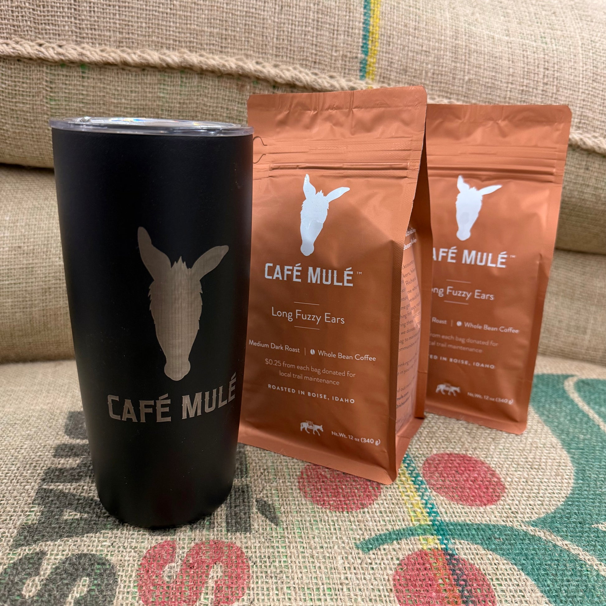A durable powder coated 20 oz. double wall stainless steel travel tumbler by MiiR laser etched with the Café Mulé logo along with two 12 oz. bags of our most popular coffee: Long Fuzzy Ears medium-dark roast.